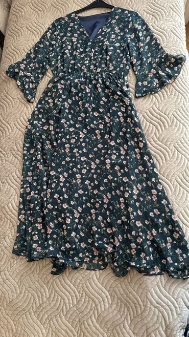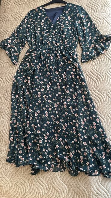 Tünd yaşıl rəngdə, çiçək naxışlı, uzun ətəkli zərif şifon qadın donu. Donun bel hissəsində elastik büzmə detalı mövcuddur. Yüngül parçadan hazırlanıb, ziyafət və ya xüsusi günlər üçün idealdır. 1 dəfə geyinilib