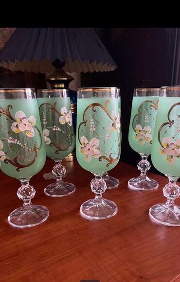 Şərab və ya şampan üçün istifadə edilə bilən üç ədəd yaşıl rəngli qədəh dəsti. Bu qədəhlər, əl ilə çəkilmiş çiçək naxışları ilə bəzədilmişdir və qızılı rəngli detallara malikdir. Yüksək qabartma na...