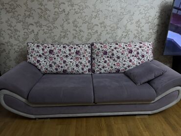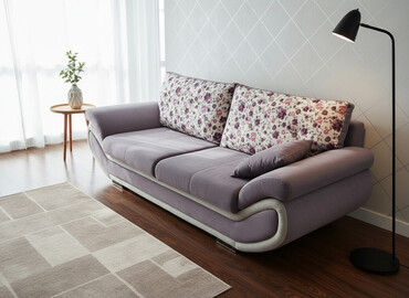 - Rəng: Bənövşəyi/boz oturacaq və qol hissələri, açıq boz kontur; arxa yastıqlarda çiçək naxışlı (ağ fon üzərində bənövşəyi və çəhrayı tonlar).
