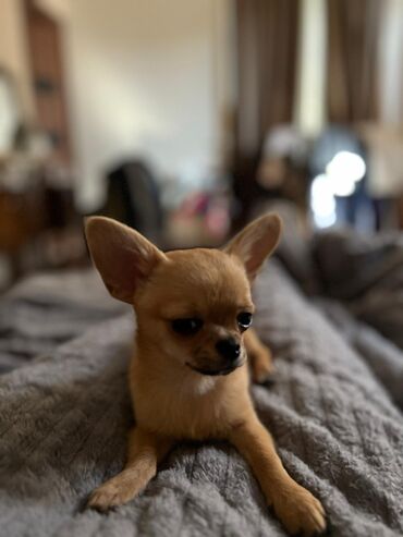 Çox balaca ölçülü, qısa tüklü, açıq-qəhvəyi (fawn) rəngli çihuahua balası.