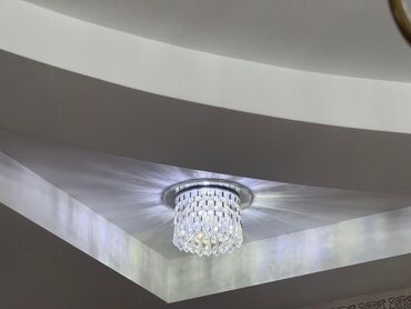Şüşə-kristal tavan lampası (plasfon) - Forma: dairəvi, yarı-qapalı tavan tipli - Material: parlaq xrom rəngli korpus, kəsimli kristal elementlər və şüşə bəzəklər - Dizayn: ağ fon üzərində qızılı ç...