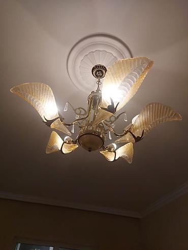 2) Qızılı detallar və yarpaq formalı şüşə qanadlarla zəngin klassik çoxqollu lüstur, asma kristal bəzəklər.