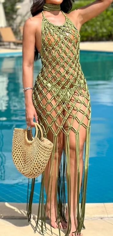 Bu dəst tankini tipli üst hissədən və şortlardan ibarətdir. Üst hissə geniş kəsimə və dairəvi yaxalığa malikdir. Şortlar dizdən yuxarı uzunluqdadır. Hər iki hissə yaşıl rəngdədir və ağ yarpaq naxış...