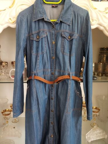 Mavi rəngli qadın donu 46 beden - Stil: Rahat A-kəsim, dizdən aşağı midi uzunluq - Parça: Cins effektli yumşaq əsas parça; qollar şifon tipli, ağ-mavi naxışlı və həcimli (buf) formadadır - Yaxa: D...