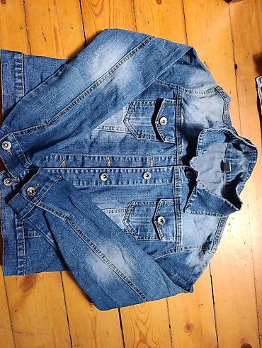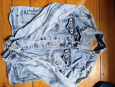 Ölçü etiketləri və brend işarələri şəkillərdə görünür. Tünd və açıq ton variantları ilə klassik cins gödəkçə axtaranlar üçün praktik seçimdir.