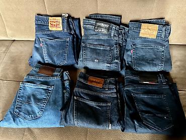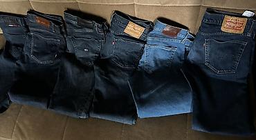 - Cins şalvarlar: Levi’s (etiketlər görünür), Hugo Boss, Tommy Hilfiger və digər brendlər. Arxa cibdə brend nişanları, beşcibli klassik kəsimlər. Tünd mavıdan açıq mavi tonlara qədər müxtəlif yuyulma effektləri. Kəmər keçidləri, fermuar və ya düyməli bağlanma, arxa ciblərdə dekorativ tikişlər.