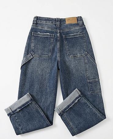 - Düz və bir az boş kəsim; qatlanmış balaqlar xam kənarlı