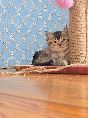 Britan tipli balaca pişik balası - Cins: Britan (ehtimalən Scottish/British tipli, qısa tüklü) - Rəng: qızılı tabby – qara zolaqlar, qarın hissəsində xallı naxış - Gözlər: iri, yumru - Qulaqlar: y...