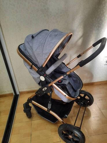 Uşaq arabası - Tip: beşik tipli (lyulka) uşaq arabası - Rəng: qəhvəyi kumaş, qızılı/bronza çərçivə - Çərçivə: yüngül metal konstruksiya - Təkərlər: 4 təkərli, ön təkərlər fırlanan, arxa təkərlər b...