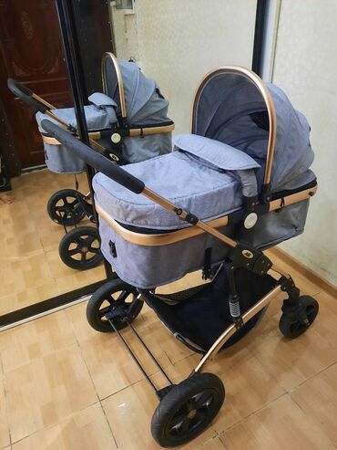 Uşaq arabası – 2-in-1 tipli beşik-araba - Rəng: boz - Çərçivə: yüngül alüminium konstruksiya - Təkərlər: ön qollu fırlanan təkərlər, arxa tərəfdə iri təkərlər; amortizator yayları ilə yumşaq gediş...