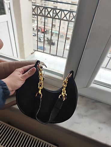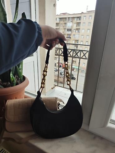Satılır: Qara çiyin çantası – zəncirli - Material: süni dəri - Rəng: qara, qızılı metal detallarla - Dizayn: ön hissədə qızılı dairəvi nitlər, kənarlarda “X” formalı bəzəklər; qapaqlı və metal kili...