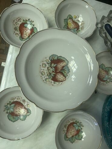 Çiyələk naxışlı porselen desert dəsti - Dəst tərkibi: 1 ədəd böyük desert/kompot qabı və 5 ədəd kiçik