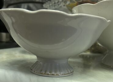 Müxtəlif qab-qacaq dəsti – bir yerdə - Porselen: qızılı haşiyəli sousenlər və desert boşqabları, çiçək naxışlı oval servis boşqabı. - Şüşə-kristal: iki ədəd yarpaq formalı iri meyvə/şirniyyat qabı...