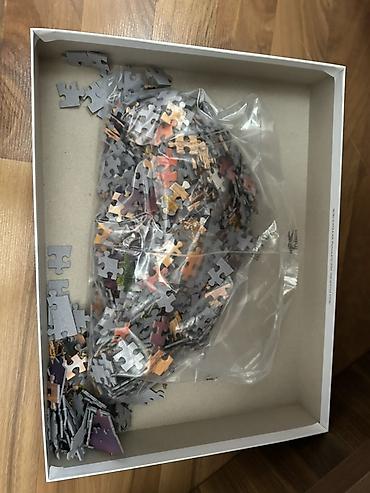 Qutuda: 1000 ədəd pazl hissəsi və üz qabığında tam şəkil.