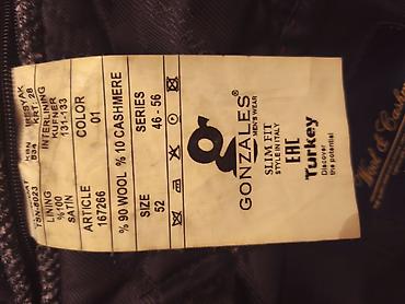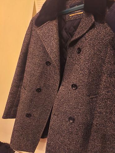 Kişi palto-su. - Klassik dizayn, tünd boz rəngdə, xırda şevron/əlvan zolaqlı faktura. - 4 düyməli ön bağlama. - Klassik yaxalıq (notched lapel). - İki yan ciblə. - Düz kəsim, dizə yaxın uzunluq. - ...