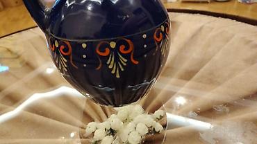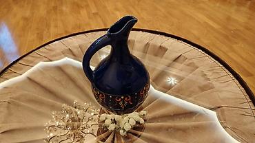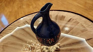 Dekorativ keramik sürahi - Material: parlaq glazurlu keramika - Rəng: tünd göy (lacivərt) - Üslub: şərq/qədim motivli əl naxışları - Bəzək: qabın gövdəsində qızılı və rəngli boyalarla çəkilmiş ant...