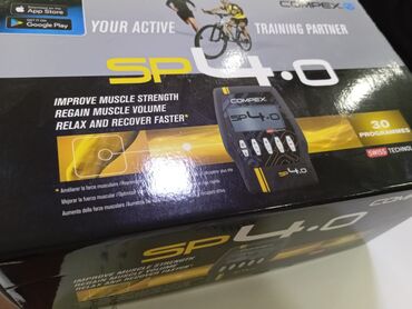 Qutunun üzərində: SP 4.0, 30 programmes, Swiss Technology, “Improve muscle strength / Regain muscle volume / Relax and recover faster”.
