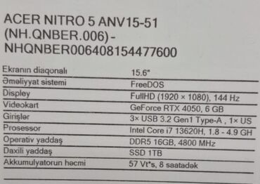 Yeni Acer Nitro, 17.3 ", Intel Core i5, > 2 TB, Ünvandan götürmə, Pulsuz çatdırılma, Ödənişli çatdırılma