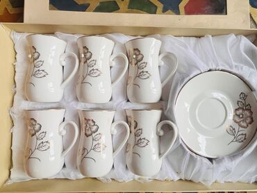 6 nəfərlik kofe dəsti (6 nəlbəki + 6 stəkan) Çin məhsuludur. Yenidir, istifadə olunmayıb. Lakin nəlbəkinin birinin altında kiçik defekt var...