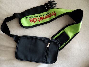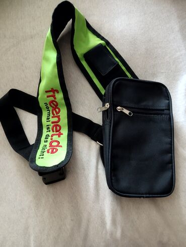 - Rəng: qara çanta, neon yaşıl geniş kəmər (üzərində “freenet.de – normal ist das nicht!” yazısı).