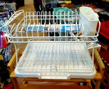 Mətbəx üçün 3 mərtəbəli qab‑qacaq rəfi - Material: bərk plastik - Rənglər: qəhvəyi karkas, krem rəngli bölmələr - Üst hissə: boşqablar üçün şaquli bölməli damcısavar səbət, yanında çəngəl‑qaşıq üç...