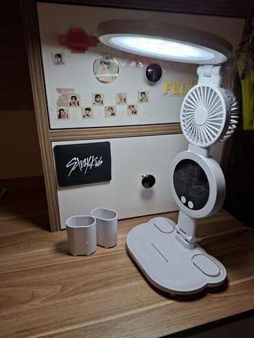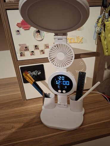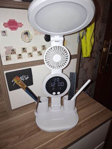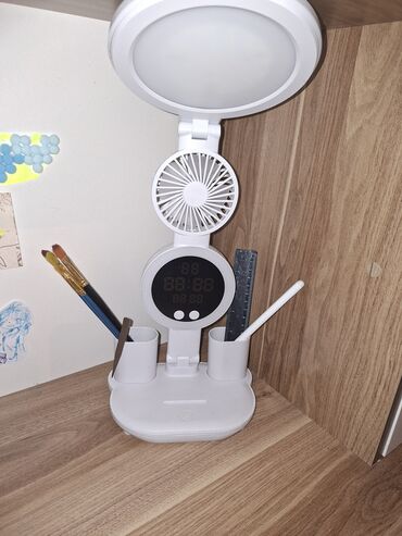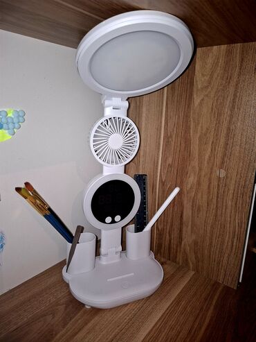 Çoxfunksiyalı masaüstü cihaz – LED stol lampası + mini ventilyator + rəqəmsal saat/termometr + qələm qabı + telefon üçün dayaq.