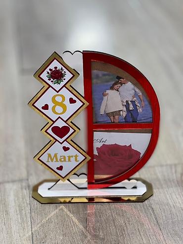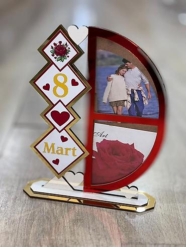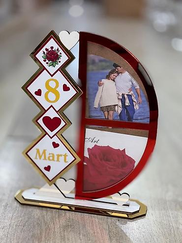 - Dizayn: Ürək və romb elementləri ilə bəzədilmiş, “8 Mart” yazılı kompozisiya. Qırmızı, qızılı və ağ rənglərin kombinasiyası, parlaq akril səthlər və güllü motivlər.