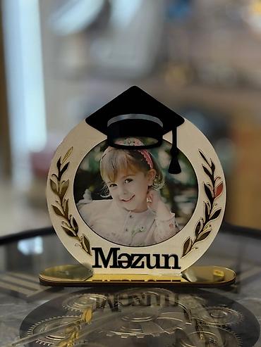 - Dizayn: dairəvi çərçivə, yuxarı hissədə məzun papağı fiquru, iki tərəfdə qızılı yarpaq dekoru, ön hissədə “Məzun” yazısı.