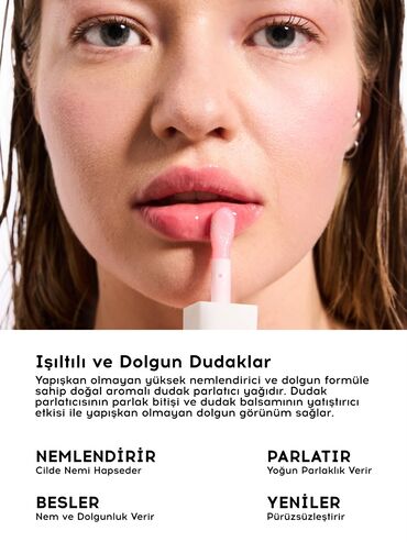 Tərkibindəki meyvə yağları və E vitamini sayəsində dodaqları qoruyan, gücləndirən və qidalandıran təbii ətirli dodaq parladıcı yağı. Dodaq parladıcısının parlaq bitişi və dodaq balzamının sakitləşdirici təsirinin birləşməsi ilə yapışqan olmayan, yüksək nəmləndirici və dolğunlaşdırıcı formula.