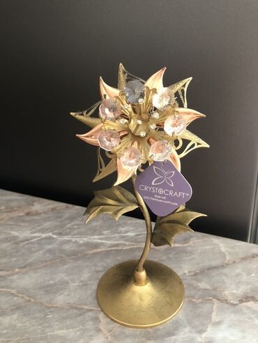 - Dizayn: qızılı rəngli metal sap və yarpaqlar, ulduzvari çiçək başlığı; iç hissədə çoxüzlü şəffaf və açıq çəhrayı kristal “çiçək ləçəkləri”, mərkəzdə kiçik parlaq daşlar