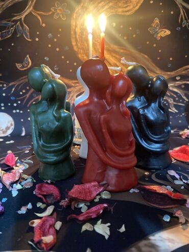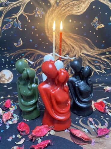 Əl işi dekorativ şamlar – bədii fiqurlu kolleksiya - Dizayn: Heykəltəraş üslubunda fiqurlar və simvolik motivlər. Mərkəzdə qırmızı “əllər arasında gül” kompozisiyalı şam, yanında heykəlvari siluet...