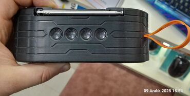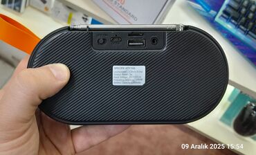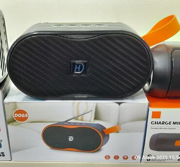 Qutudan görünənlər: cihazın özü və şarj üçün micro‑USB portu. Şəkildəki model D06S olaraq qeyd edilib. Musiqini Bluetooth, USB, microSD və ya AUX vasitəsilə dinləmək, eləcə də FM radioya qulaq asmaq mümkündür.