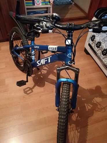 SAFT dağ/şose tipli velosiped - Çərçivə: yüngül material, qara-qırmızı-göy dizayn, “SAFT” loqolu - Təkərlər: 24" (şinlər şəhər və yüngül off-road üçün), disk tipli əyləclər - Amortizasiya: ön amor...