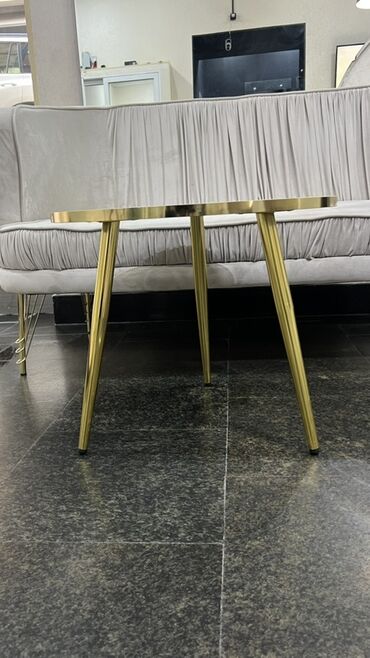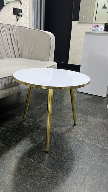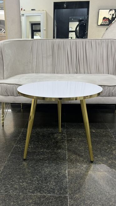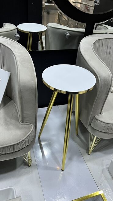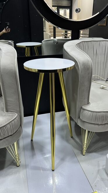 - Dizayn: minimalist və eleqant; dairəvi üstlük, incə konus formalı qızılı metal ayaqlar.