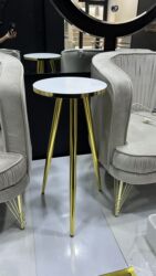 Qeyd: Şəkillərdə həm hündür yan masa, həm də aşağı orta masa göstərilib; eyni üslubda komplekt kimi uyğunlaşır. Parlaq ağ üstlük və qızılı detallar interyerə lüks vurğu qatır.
