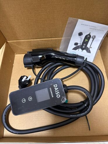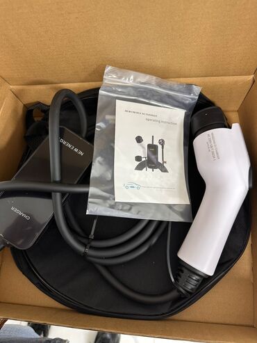 - Qutuda: şarj cihazı (idarəetmə bloku + kabel + Tip 2 konnektor), istifadə təlimatı; daşıma üçün yumru çanta görünür.