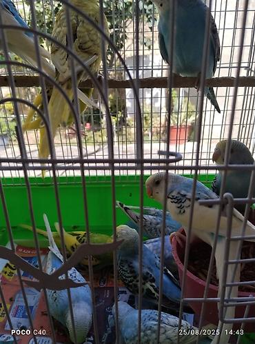 - Qəfəsdə müxtəlif rənglərdə dalğalı tutuquşular: mavi-ağ, sarı-yaşıl, ağ-mavi, zolaqlı boz-mavi tonlar.