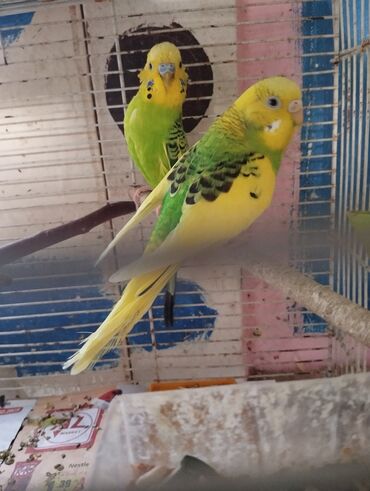 Məhsul: Ev quşları – iki dalğalı tutuquşu (budgerigar) Təsvir: - Rənglər: biri yaşıl-sarı, qara naxışlı qanadlarla; digəri mavi-ağ, qara zolaqlı qanadlarla. - Növ: Dalğalı tutuquşu (ağqulaq-budger...