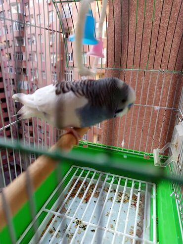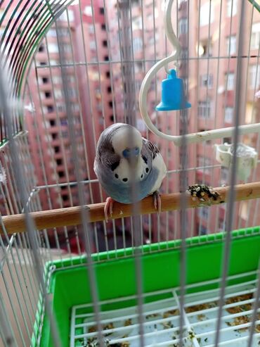 Dalmatin rənqli (ağ-göy-qaralı) dalğalı tutuquşu (budgerigar) və qəfəs dəsti.