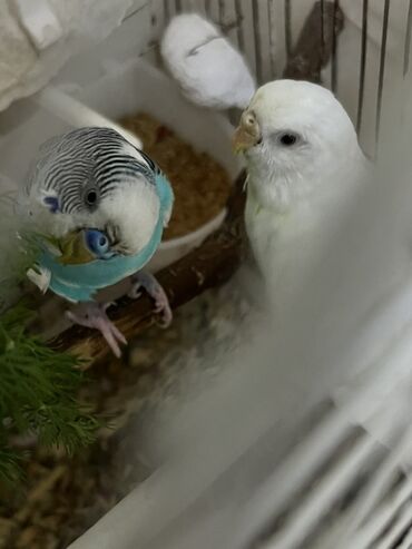 Nömrəli qəfəzdə iki dalğıç papağan (büdcəri) cütü. Xüsusiyyətlər: - Rənglər: biri tam sarı (lutino), digəri yaşıl-sarı, qara zolaqlı baş naxışları və mavi gaga üstü. - Növ: budgerigar (undulat). -...