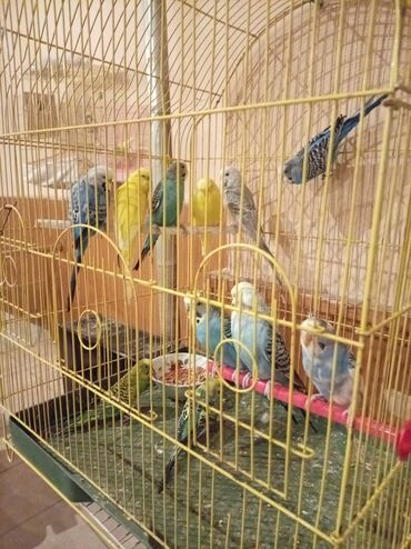 Dalğalı tutuquşular və qəfəs dəsti - Növ: Dalğalı tutuquşu (budgerigar) - Rənglər: Yaşıl-sarı, mavi-ağ və boz-çəhrayı tonlarda müxtəlif fərdlər - Say: Bir neçə tutuquşu birlikdə - Qəfəs: Metallik ...