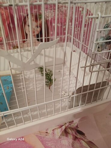 - Daxili aksesuarlar: 2 yem qabı (narıncı və ağ), su qabı, taxta perch, yelləncək/oyuncaq, mavi plastik altlıq lövhəsi, mineral/kalsium daşı, yaşıl təzə budaq (yem kimi)