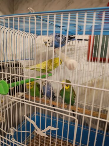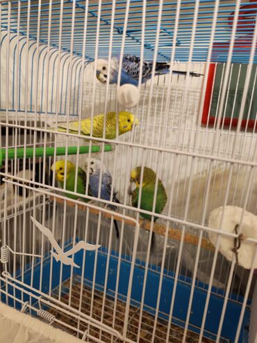 Dalmatin və müxtəlif rənglərdə dalğıc (budaqar) cinsli şirin dalğalı tutuquşular dəsti və qəfəs komplekti.