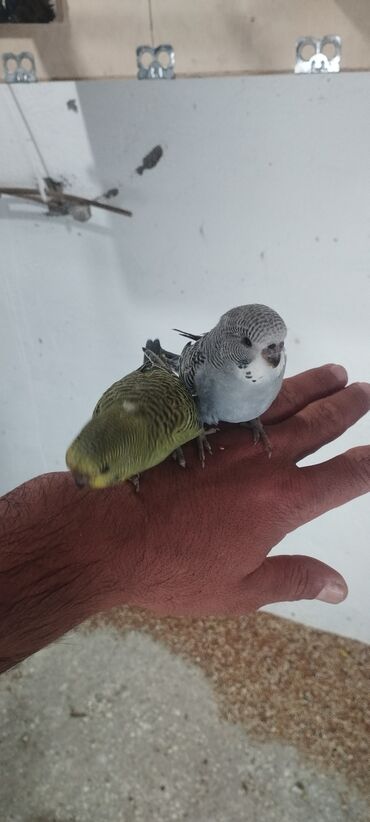 Məhsul: Ev quşları – iki dalğalı tutuquşu (budgerigar) Təsvir: - Rənglər: biri yaşıl-sarı, qara naxışlı qanadlarla; digəri mavi-ağ, qara zolaqlı qanadlarla. - Növ: Dalğalı tutuquşu (ağqulaq-budger...