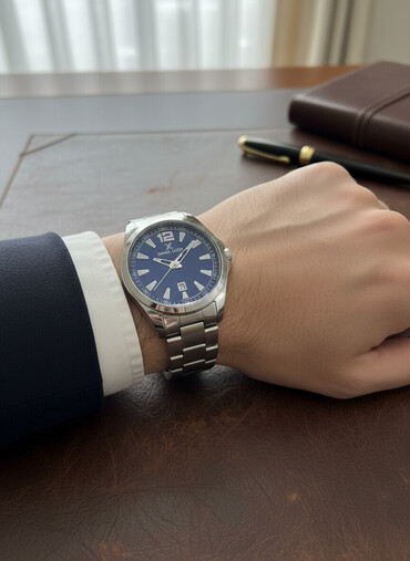 - Siferblat: tünd mavi, iri ağ indekslər və “12” rəqəmi, dəqiqə işarələmələri olan xarici halqa