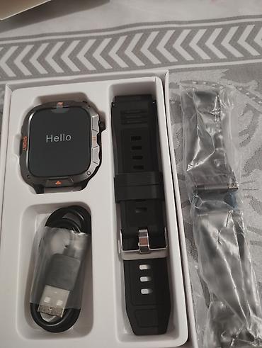 - Qutuda: saat gövdəsi, qara silikon qayış, metal qayış, USB şarj kabeli