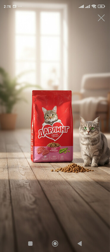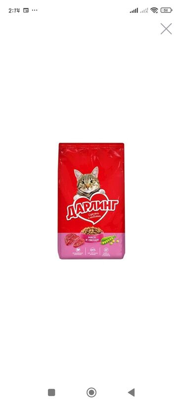 - Paket: qırmızı rəngli, üzərində pişik təsviri və “Мясо и овощи” qeyd olunur