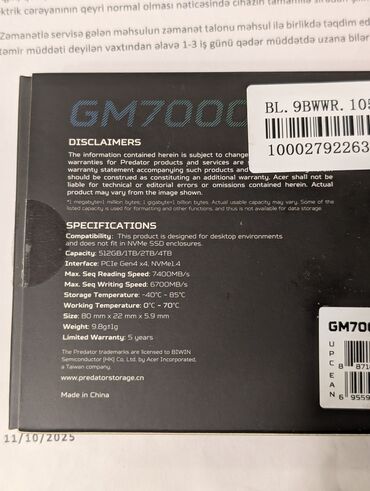 Acer Predator GM7000 1TB SSD satılır. Oktyabrda almışam, təzədir, 1 dəfə baxmaq üçün qutusu açılıb, istifadə edilməyib. Lazım olmadığı üçün satıram. Whatsappda aktivdir. Əlavə olaraq, eyni qiymətə ana plata Gigabyte B650M GAMING PLUS WIFI satıram. İkisi birlikdə 450AZN. Əlavə məlumat üçün yazın.