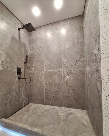 - Hamam və s/u: iri formatlı keramika/granit plitələrin kəsimi və quraşdırılması, duş zonası üçün maililiyin verilməsi, duş ləvazimatlarının montajı, suya davamlı hidroizolyasiya işləri