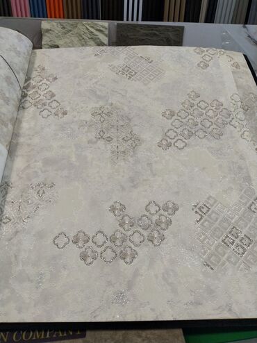 Dekorativ divar kağızı – açıq boz/krem tonlarında, tekstural fon üzərində parıltılı relyef naxışlarla.